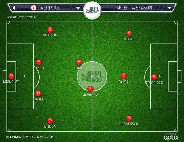 While that would be the team I’d pick, I would be surprised if it is indeed the team that graces the Anfield pitch. Rodgers seems to view Raheem as more of an impact player at this moment in time and for that reason I believe that he will hand another start to new signing Iago Aspas, giving him the opportunity to continue adapting to our system. Questions have been raised over where it would be best to play Aspas but if he does come into the team, he is likely to take over the central attacking midfield role with Henderson and Moses either side. Even though I think Rodgers will pick Aspas over Sterling, I do feel that he may leave Wisdom at right back seeing as he isn’t likely to come under the same amount of pressure as he did at Swansea, therefore it being less beneficial for Toure’s experience to come back into the side albeit out of position. The team I expect Rodgers to pick on Saturday would like this: