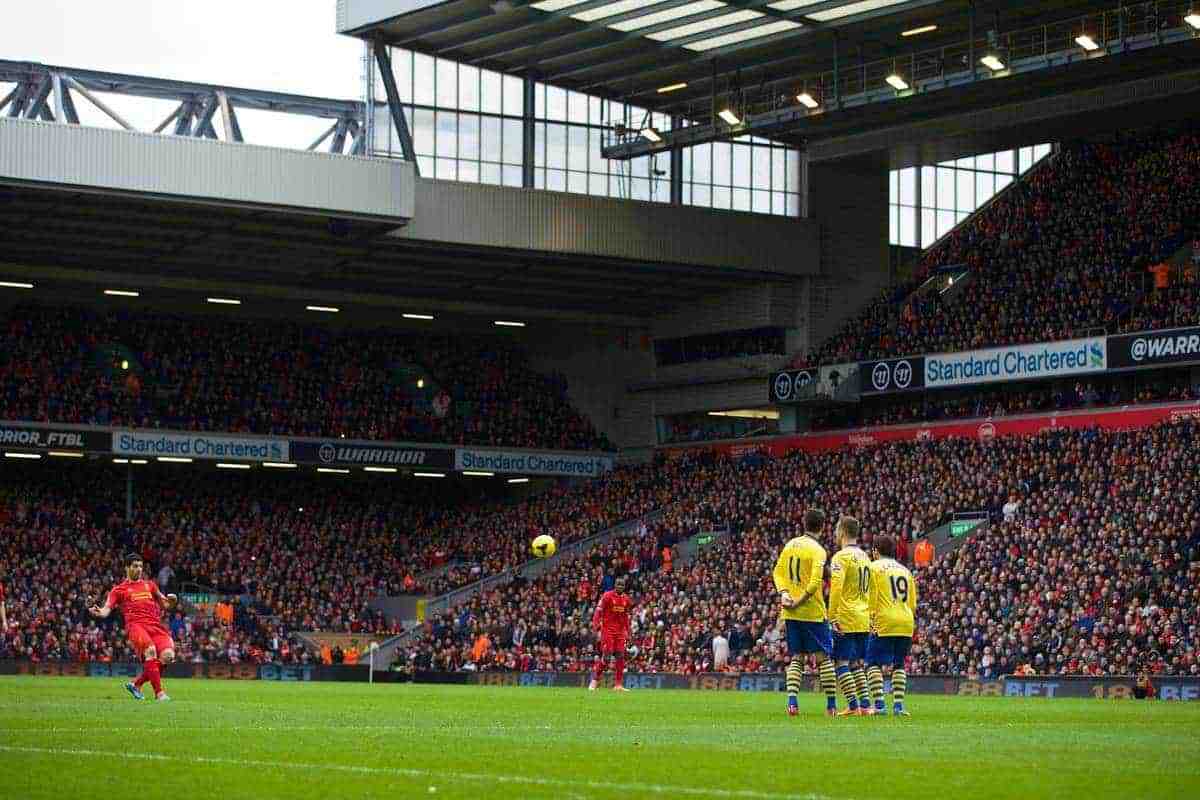 Luis Suarez takes a free-kick against Arsenal at Anfield. (Pic by David Rawcliffe/Propaganda)