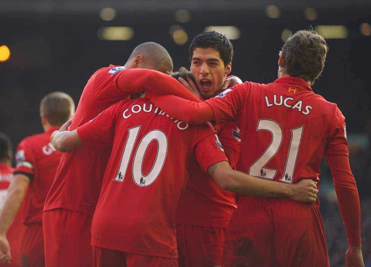 LIVERPOOL, ENGLAND - Sunday, February 17, 2013: Liverpool's new signing Philippe Coutinho Correia celebrates scoring the second goal against Swansea City during the Premiership match at Anfield. (Pic by David Rawcliffe/Propaganda)