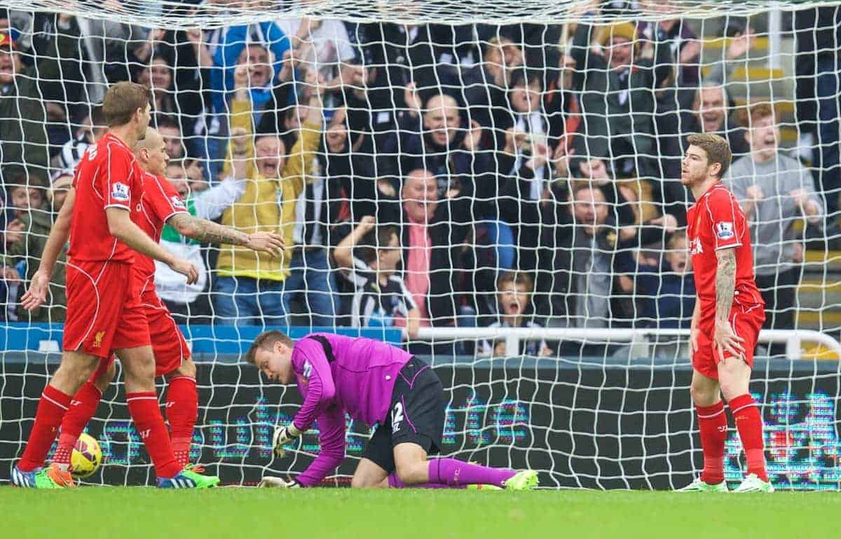 NEWCASTLE-UPON-TYNE, ENGLAND - Saturday, November 1, 2014: Liverpool's goalkeeper Simon Mignolet and Alberto Moreno look dejected as Newcastle United score the first goal during the Premier League match at St. James' Park. (Pic by David Rawcliffe/Propaganda)