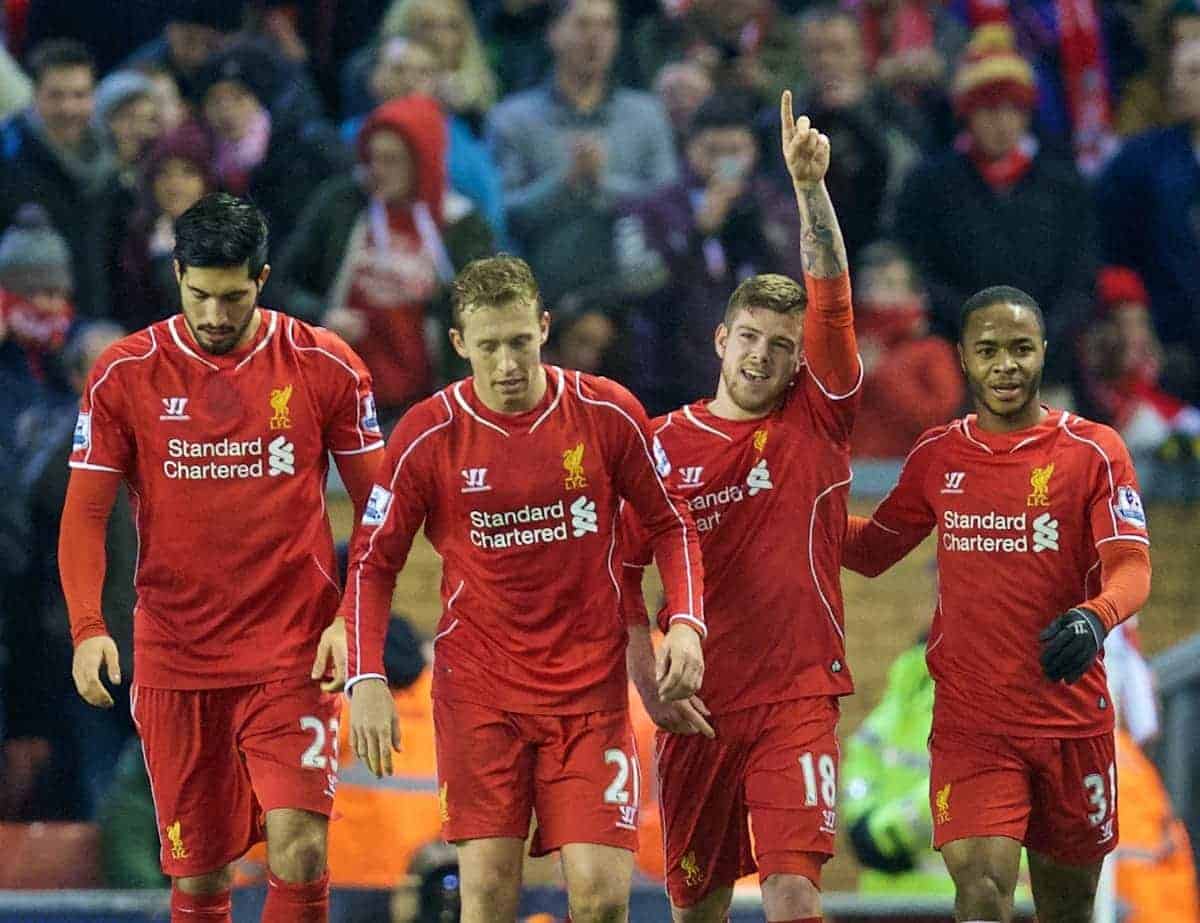 LIVERPOOL, ENGLAND - Monday, December 29, 2014: Liverpool's Alberto Moreno celebrates scoring the first goal against Swansea City during the Premier League match at Anfield. (Pic by David Rawcliffe/Propaganda)