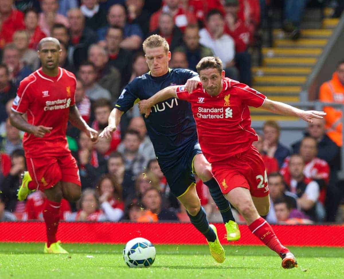 LIVERPOOL, ENGLAND - Sunday, August 17, 2014: Liverpool's Joe Allen in action against Southampton during the Premier League match at Anfield. (Pic by David Rawcliffe/Propaganda)