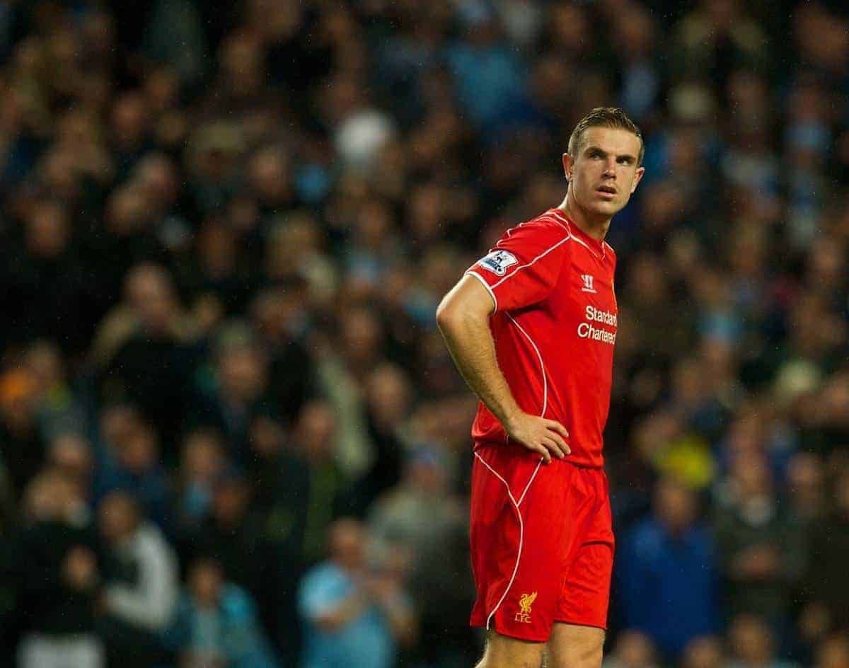 MANCHESTER, ENGLAND - Monday, August 25, 2014: Liverpool's Jordan Henderson looks dejected as Manchester City score the third goal during the Premier League match at the City of Manchester Stadium. (Pic by Chris Brunskill/Propaganda)