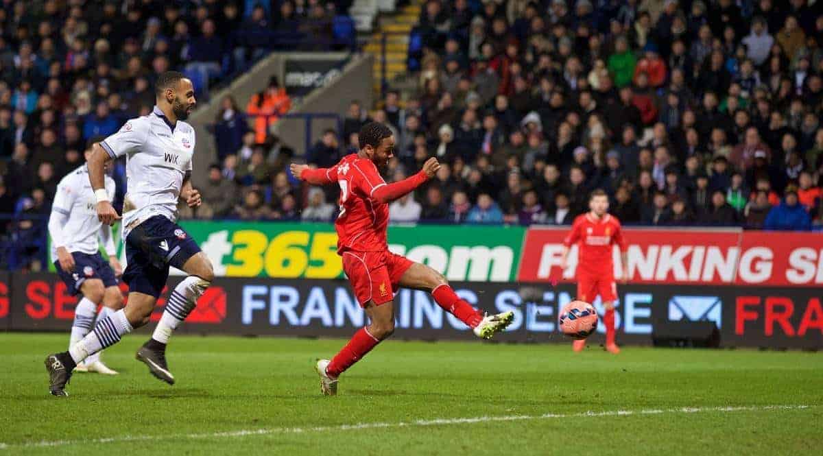 BOLTON, ENGLAND - Wednesday, February 4, 2015: Liverpool's Raheem Sterling scores the first goal against Bolton Wanderers during the FA Cup 4th Round Replay match at the Reebok Stadium. (Pic by David Rawcliffe/Propaganda)