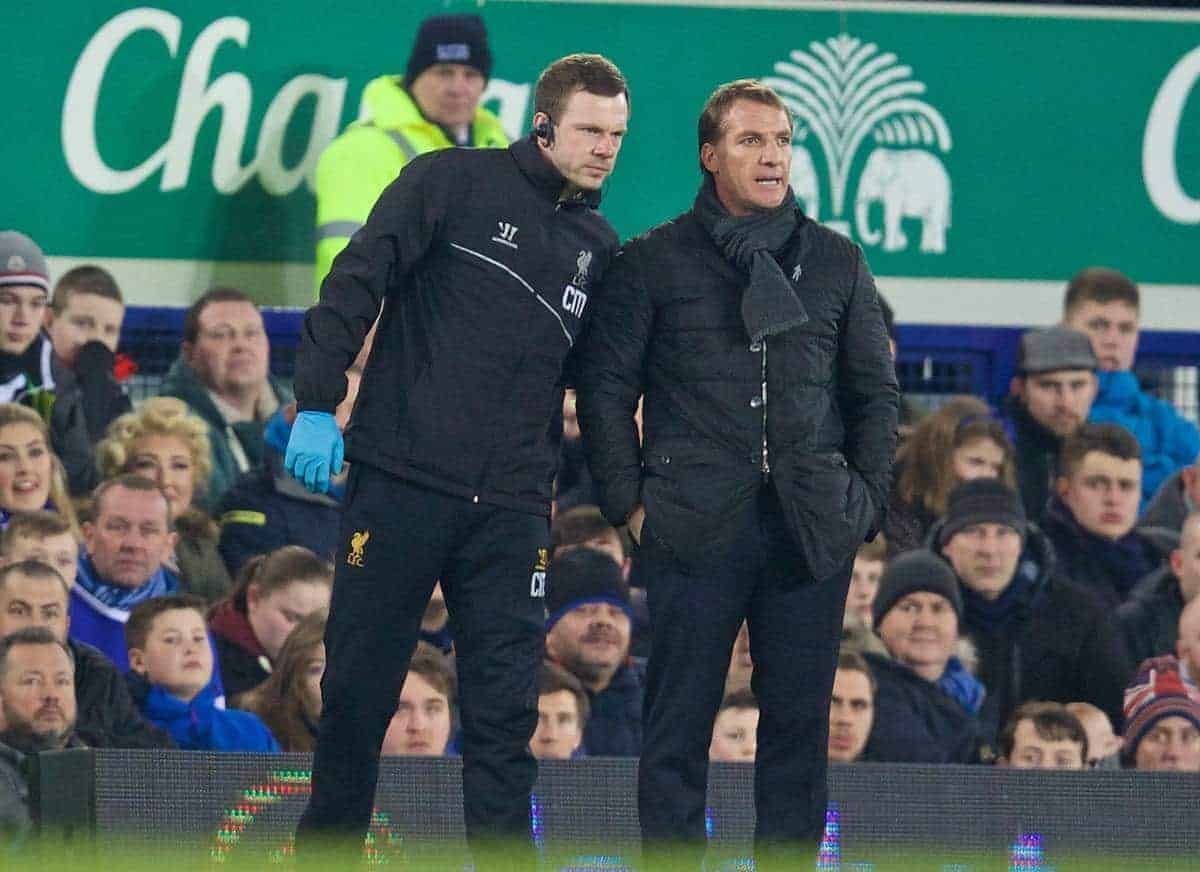 LIVERPOOL, ENGLAND - Friday, February 6, 2015: Liverpool's physiotherapist Chris Morgan gives manager Brendan Rodgers an update after Daniel Sturridge leaves the substitute bench down the tunnel against Everton during the Premier League match at Goodison Park, the 224th Merseyside Derby. (Pic by David Rawcliffe/Propaganda)