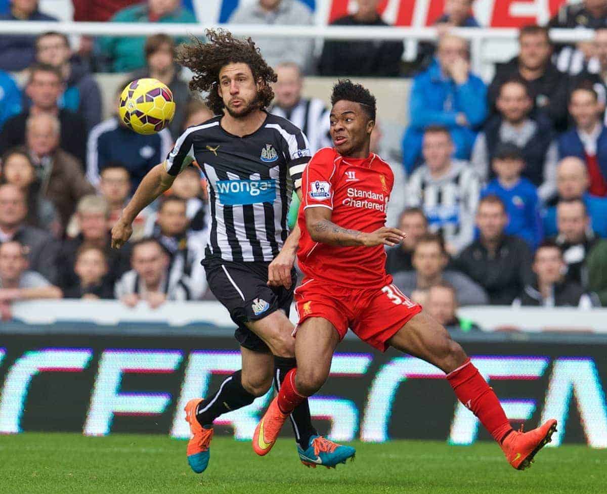 NEWCASTLE-UPON-TYNE, ENGLAND - Saturday, November 1, 2014: Liverpool's Raheem Sterling in action against Newcastle United's captain Fabricio Coloccini during the Premier League match at St. James' Park. (Pic by David Rawcliffe/Propaganda)