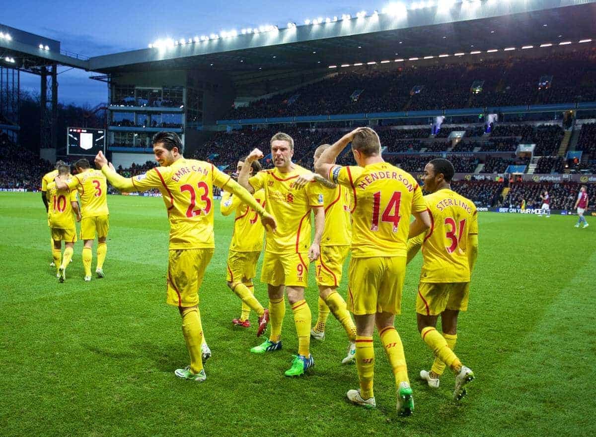BIRMINGHAM, ENGLAND - Saturday, January 17, 2015: Liverpool's Rickie Lambert celebrates scoring the second goal against Aston Villa with the travelling supporters during the Premier League match at Villa Park. (Pic by David Rawcliffe/Propaganda)