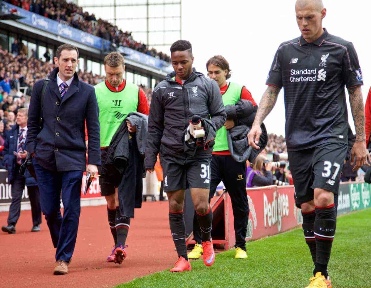 STOKE-ON-TRENT, ENGLAND - Sunday, May 24, 2015: Liverpool's substitute Raheem Sterling cannot look at the supporters as he walks off at half-time 5-0 down to lowly Stoke City during the Premier League match at the Britannia Stadium. (Pic by David Rawcliffe/Propaganda)