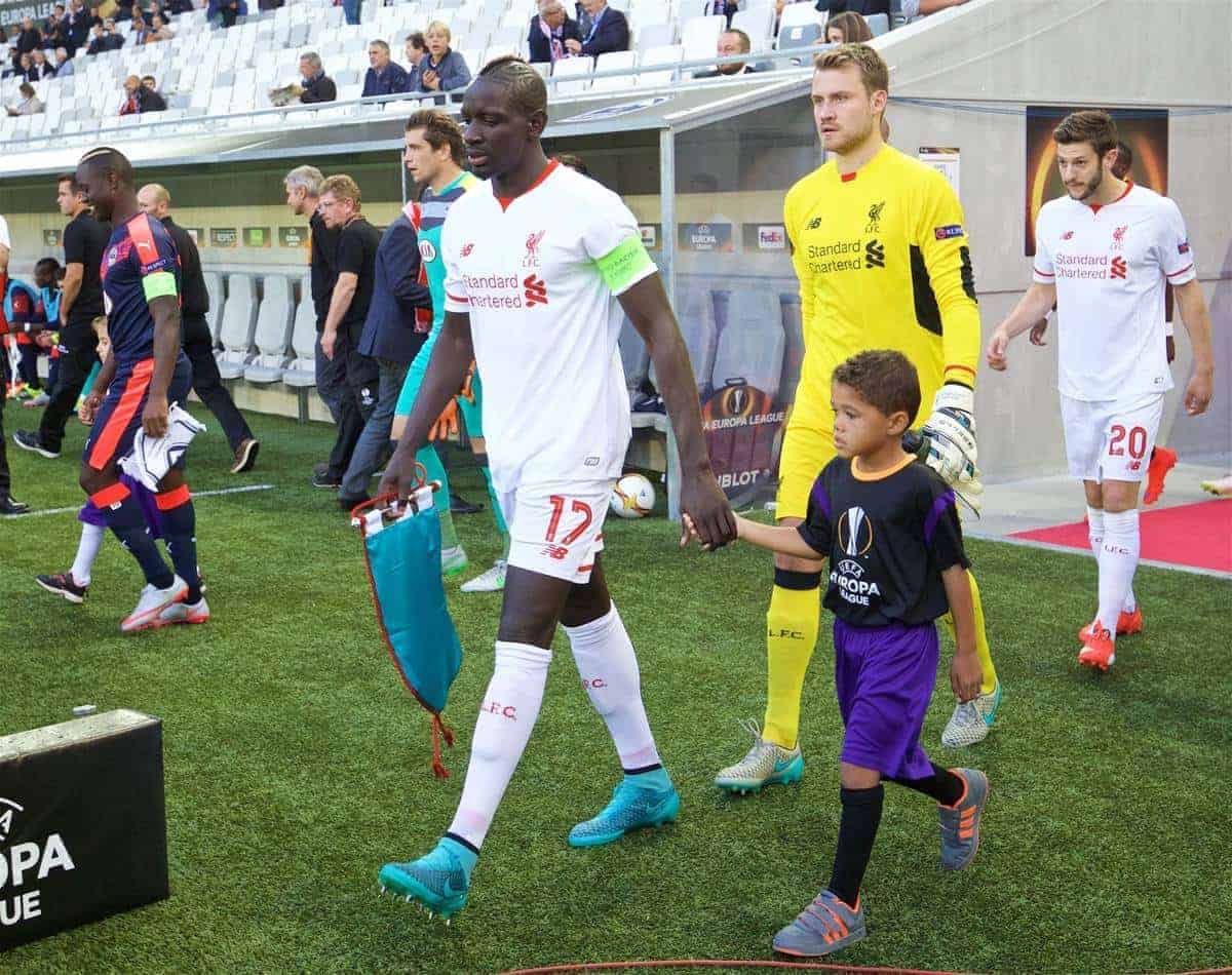 BORDEAUX, FRANCE - Thursday, September 17, 2015: Liverpool's captain Mamadou Sakho walks out to face FC Girondins de Bordeaux during the UEFA Europa League Group Stage Group B match at the Nouveau Stade de Bordeaux. (Pic by David Rawcliffe/Propaganda)