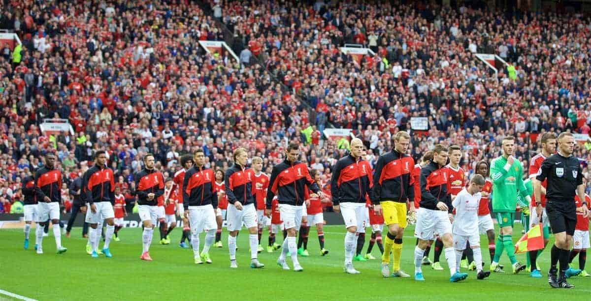 MANCHESTER, ENGLAND - Saturday, September 12, 2015: Liverpool's captain James Milner leads his side out to face Manchester United during the Premier League match at Old Trafford. (Pic by David Rawcliffe/Propaganda)