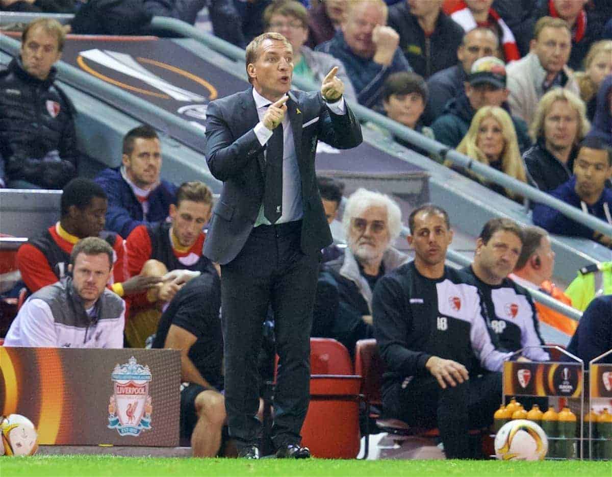 LIVERPOOL, ENGLAND - Thursday, October 1, 2015: Liverpool's manager Brendan Rodgers during the UEFA Europa League Group Stage Group B match against FC Sion at Anfield. (Pic by David Rawcliffe/Propaganda)