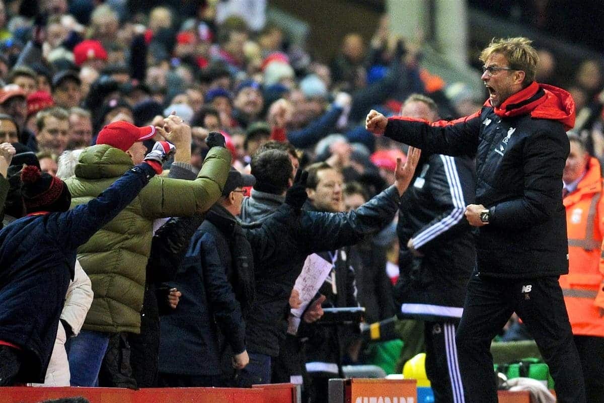 LIVERPOOL, ENGLAND - Sunday, December 13, 2015: Liverpool's manager Jürgen Klopp celebrates the equaliser goal during the Premier League match against West Bromwich Albion at Anfield. (Pic by James Maloney/Propaganda)