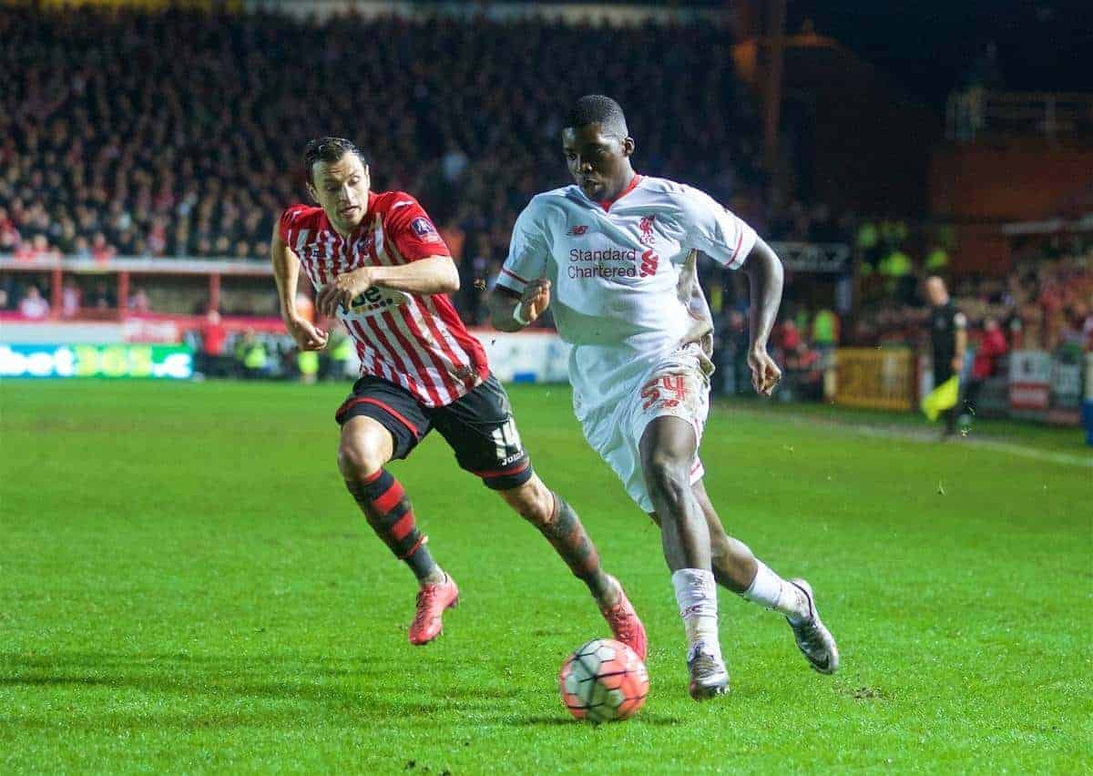 EXETER, ENGLAND - Friday, January 8, 2016: Liverpool's Sheyi Ojo in action against Exeter City during the FA Cup 3rd Round match at St. James Park. (Pic by David Rawcliffe/Propaganda)