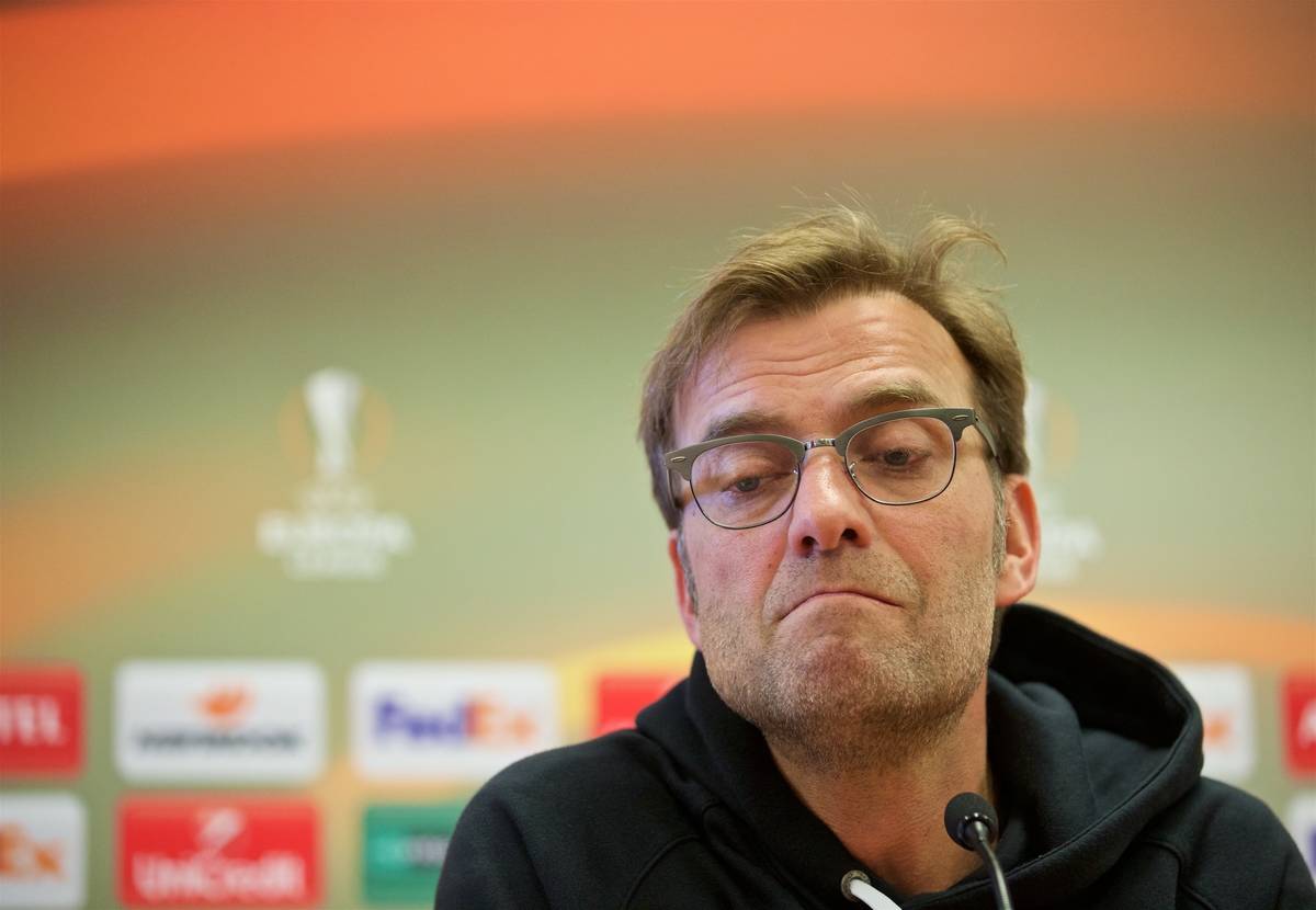 LIVERPOOL, ENGLAND - Wednesday, February 24, 2016: Liverpool's manager Jürgen Klopp during a press conference ahead of the UEFA Europa League Round of 32 1st Leg match against FC Augsburg. (Pic by David Rawcliffe/Propaganda)