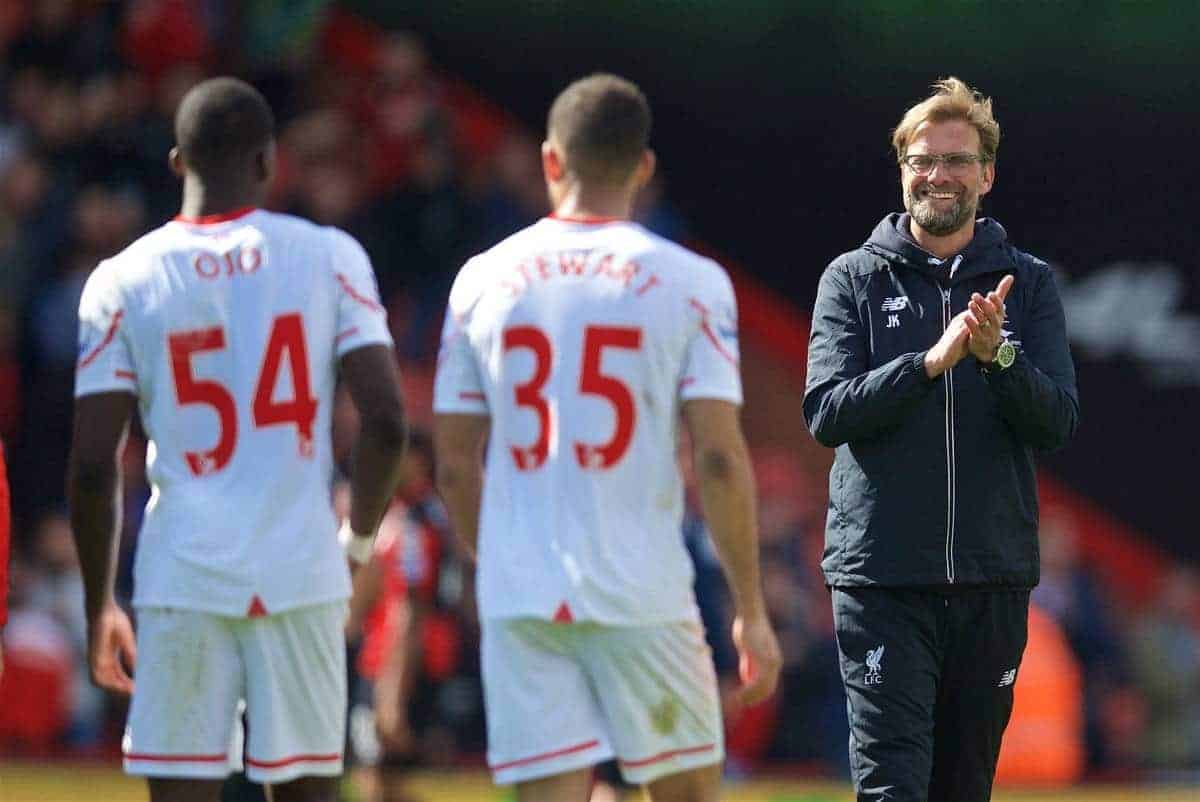 Klopp named Danny Ward (22), Connor Randall (20), Brad Smith (21), Kevin Stewart (22), Jordon Ibe (20) and Sheyi Ojo (18) in his lineup for Sunday’s 2-1 win away to Bournemouth, and was pleased with the results.