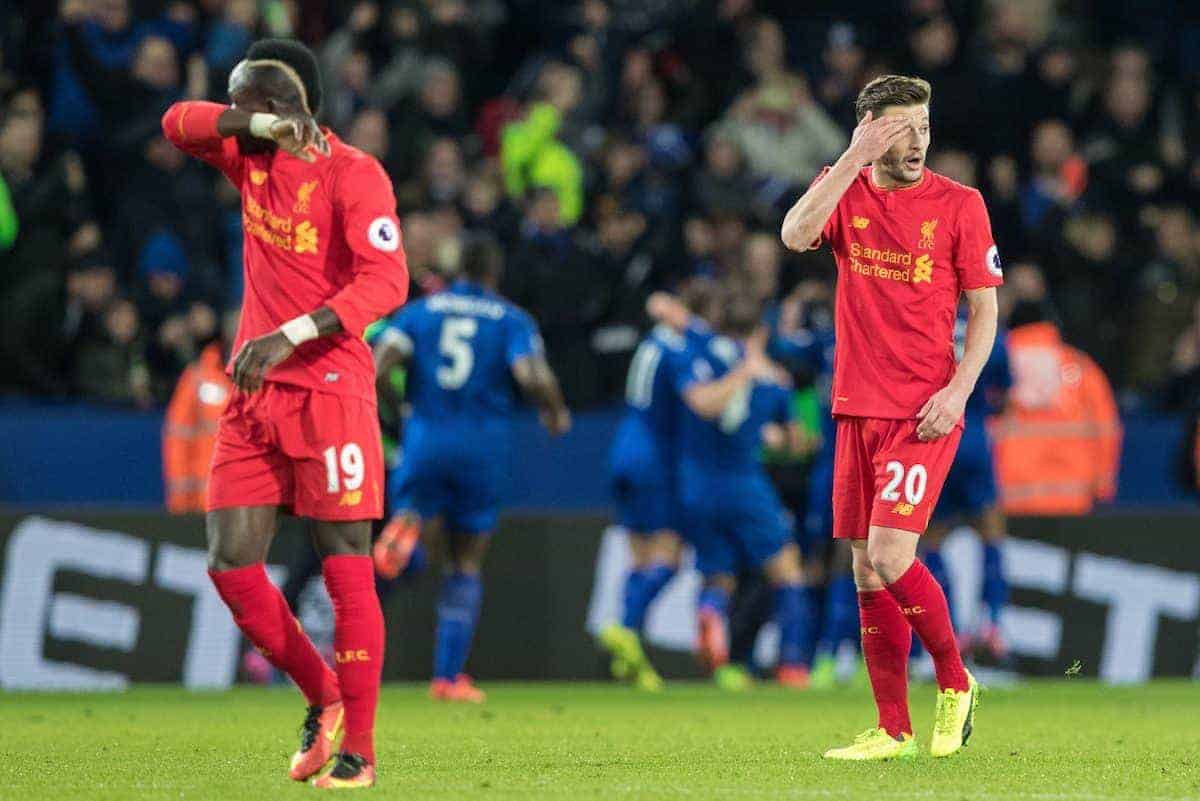 LEICESTER, ENGLAND - Monday, February 27, 2017: Liverpool's Sadio Mane and Adam Lallana look dejected after conceding the first goal against Leicester City during the FA Premier League match at the King Power Stadium. (Pic by Gavin Trafford/Propaganda)
