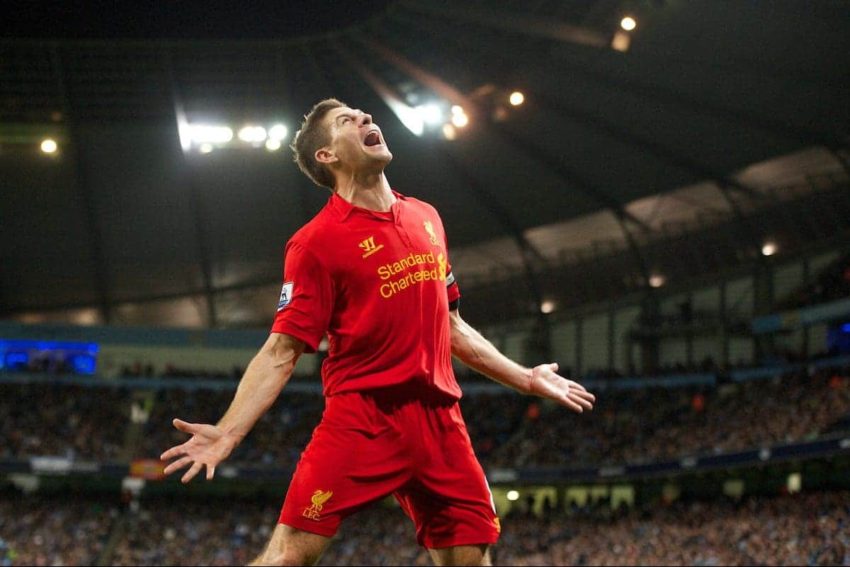 MANCHESTER, ENGLAND - Sunday, February 3, 2013: Liverpool's captain Steven Gerrard celebrates scoring the second goal against Manchester City during the Premiership match at the City of Manchester Stadium. (Pic by David Rawcliffe/Propaganda)