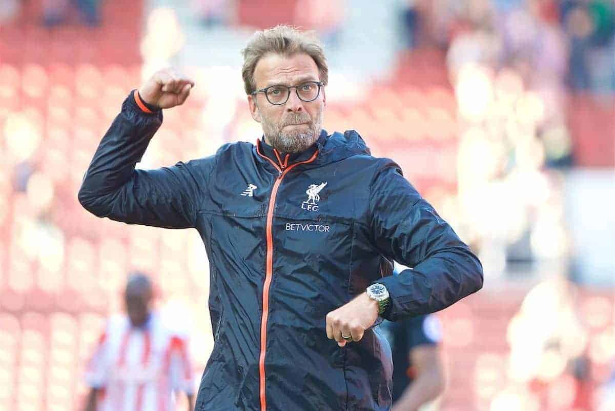 STOKE-ON-TRENT, ENGLAND - Saturday, April 8, 2017: Liverpool's manager Jürgen Klopp celebrates after the 2-1 victory over Stoke City during the FA Premier League match at the Bet365 Stadium. (Pic by David Rawcliffe/Propaganda)