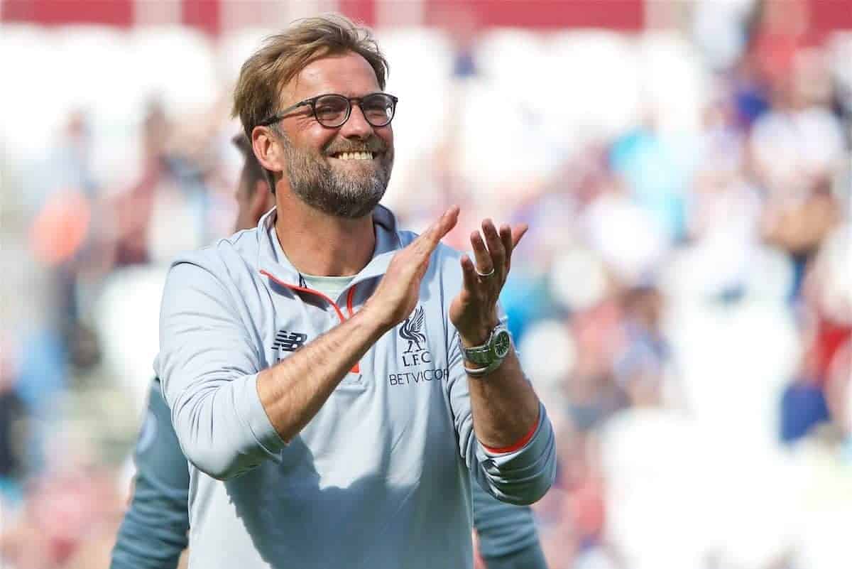 LONDON, ENGLAND - Sunday, May 14, 2017: Liverpool's manager Jürgen Klopp celebrates after his side's 4-0 victory over West Ham United during the FA Premier League match at the London Stadium. (Pic by David Rawcliffe/Propaganda)