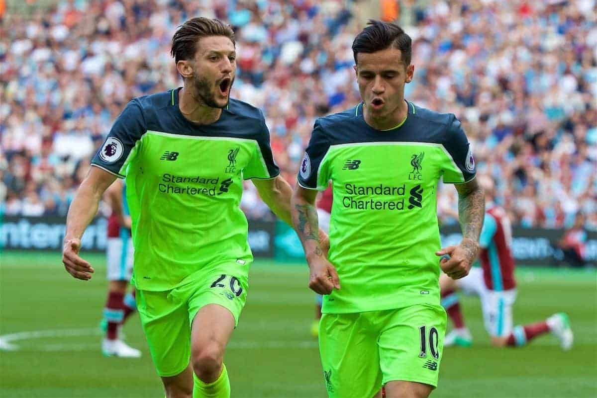 ![LONDON, ENGLAND - Sunday, May 14, 2017: Liverpool's Philippe Coutinho Correiacelebrates scoring the second goal against West Ham United with team-mate Adam Lallana [L] during the FA Premier League match at the London Stadium. (Pic by David Rawcliffe/Propaganda)](http://thisisanfield.com/wp-content/uploads/P170514-026-West_Ham_Liverpool-600x400.jpg)