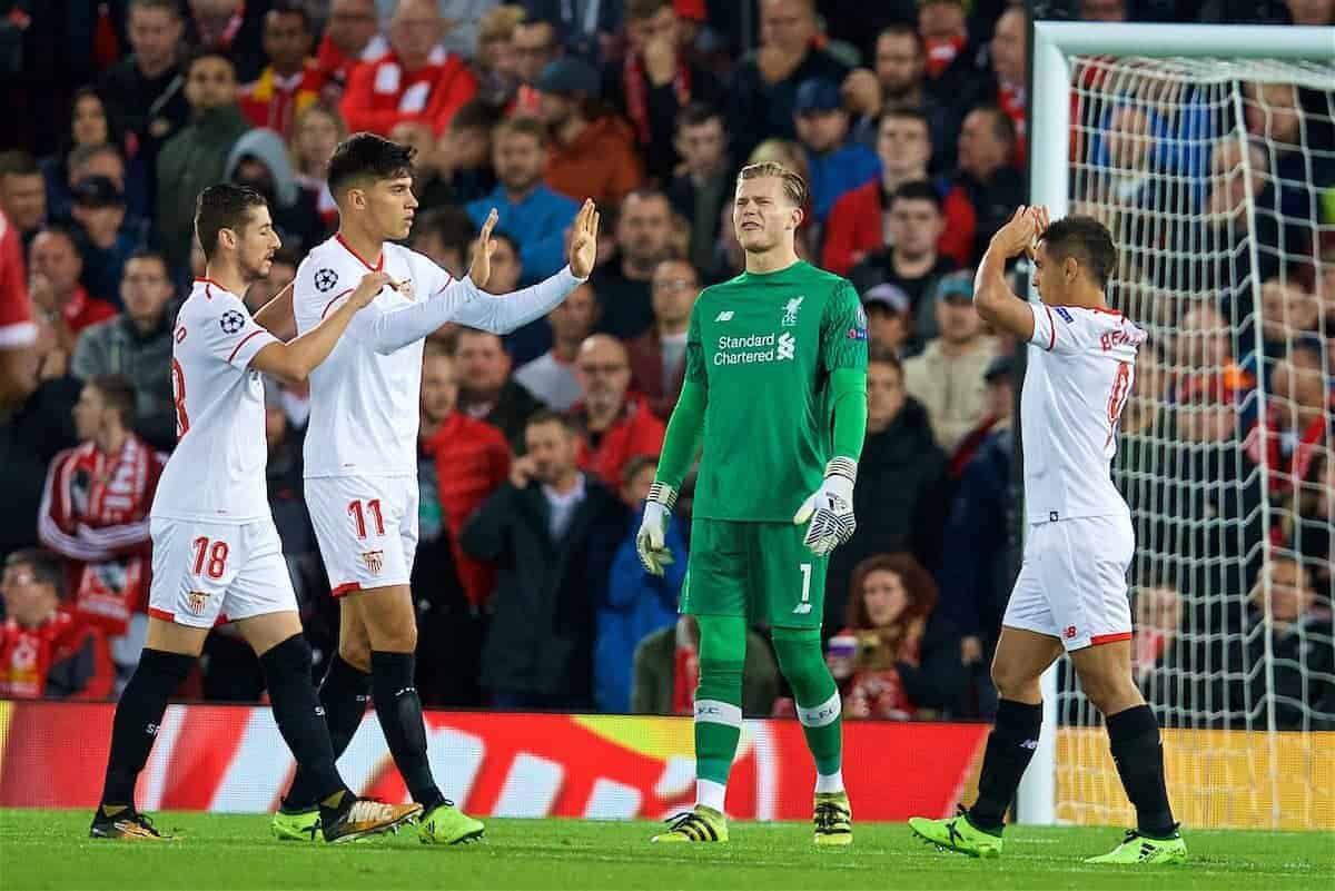 LIVERPOOL, ENGLAND - Wednesday, September 13, 2017: Liverpool's goalkeeper Loris Karius looks dejected as Sevilla score a second equalising goal during the UEFA Champions League Group E match between Liverpool and Sevilla at Anfield. (Pic by David Rawcliffe/Propaganda)