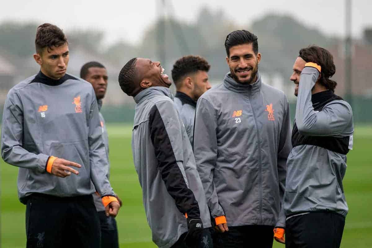 LIVERPOOL, ENGLAND - Monday, September 25, 2017: Liverpool's Daniel Sturridge laughs with Emre Can and Danny Ings during a training session at Melwood Training Ground ahead of the UEFA Champions League Group E match against FC Spartak Moscow. (Pic by Paul Greenwood/Propaganda)
