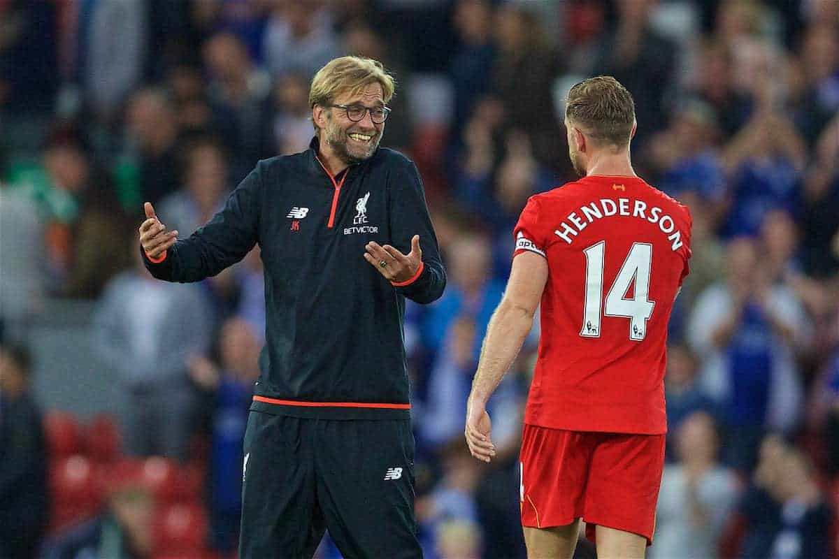 LIVERPOOL, ENGLAND - Saturday, September 10, 2016: Liverpool's manager Jürgen Klopp jokes with captain Jordan Henderson after the 4-1 victory over Leicester City during the FA Premier League match at Anfield. (Pic by David Rawcliffe/Propaganda)