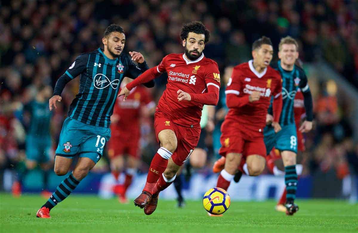 LIVERPOOL, ENGLAND - Saturday, October 28, 2017: Liverpool's Mohamed Salah and Southampton's Sofiane Boufal during the FA Premier League match between Liverpool and Southampton at Anfield. (Pic by David Rawcliffe/Propaganda)