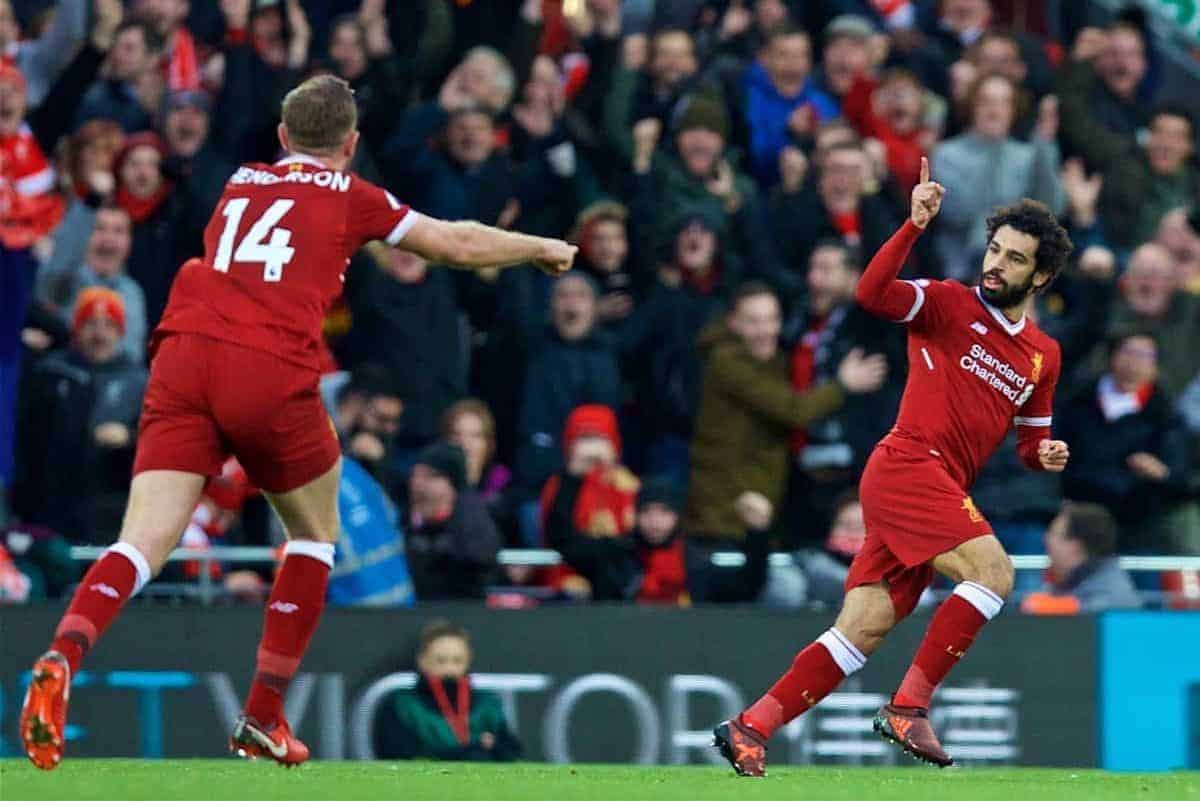 LIVERPOOL, ENGLAND - Saturday, October 28, 2017: Liverpool's Mohamed Salah celebrates scoring the first goal during the FA Premier League match between Liverpool and Southampton at Anfield. (Pic by David Rawcliffe/Propaganda)