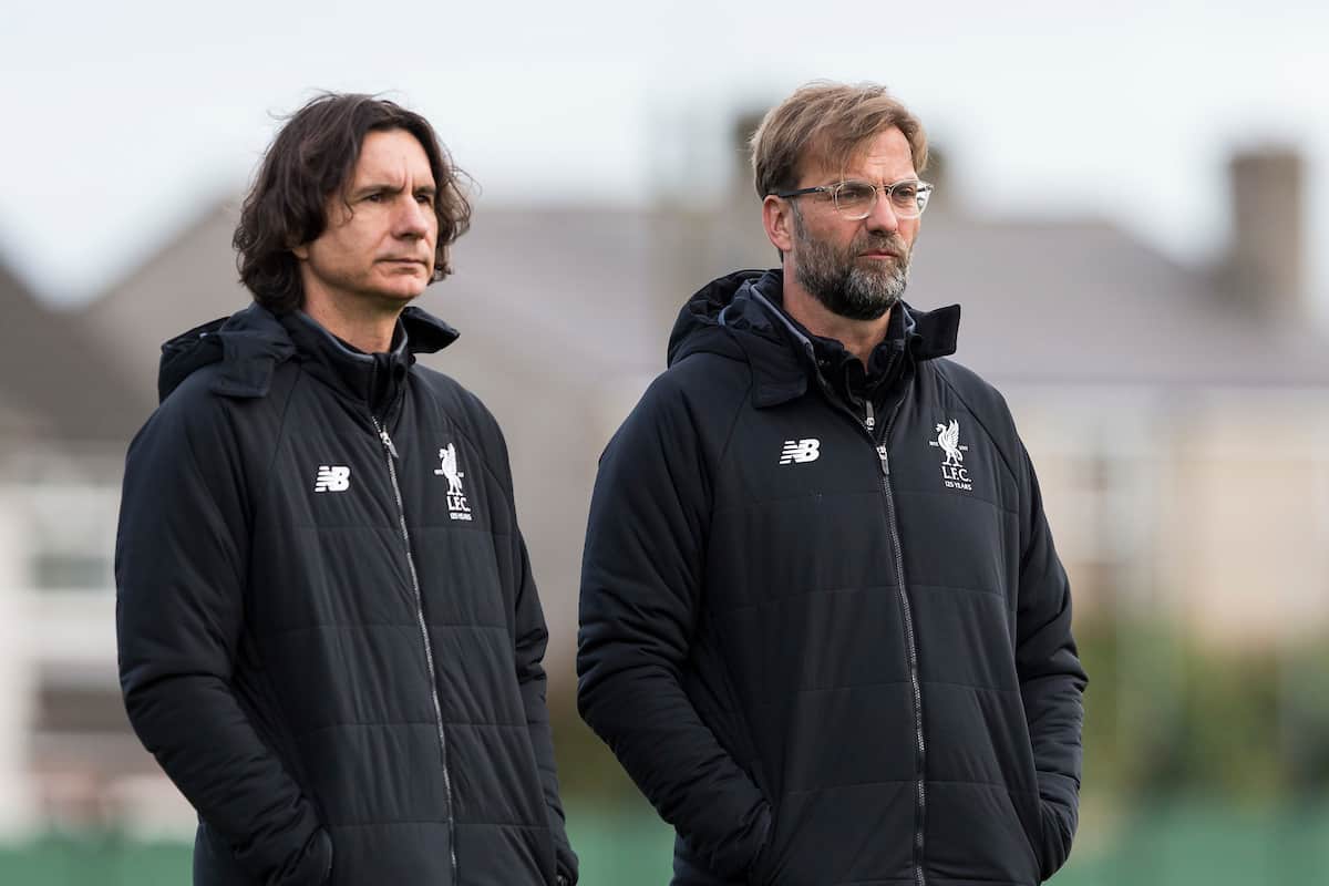 LIVERPOOL, ENGLAND - Tuesday, April 3, 2018: Liverpool's manager J¸rgen Klopp and assistant éeljko Buva? during a training session at Melwood Training Ground ahead of the UEFA Champions League Quarter-Final 1st Leg match between Liverpool FC and Manchester City FC. (Pic by Paul Greenwood/Propaganda)