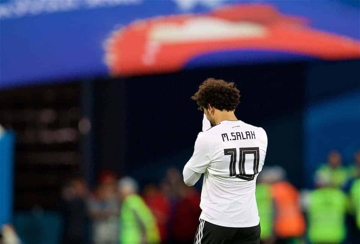 SAINT PETERSBURG, RUSSIA - Sunday, June 17, 2018: Egypt's Mohamed Salah walks off dejected as his side lose 3-1 during the FIFA World Cup Russia 2018 Group A match between Russia and Egypt at the Saint Petersburg Stadium. (Pic by David Rawcliffe/Propaganda)