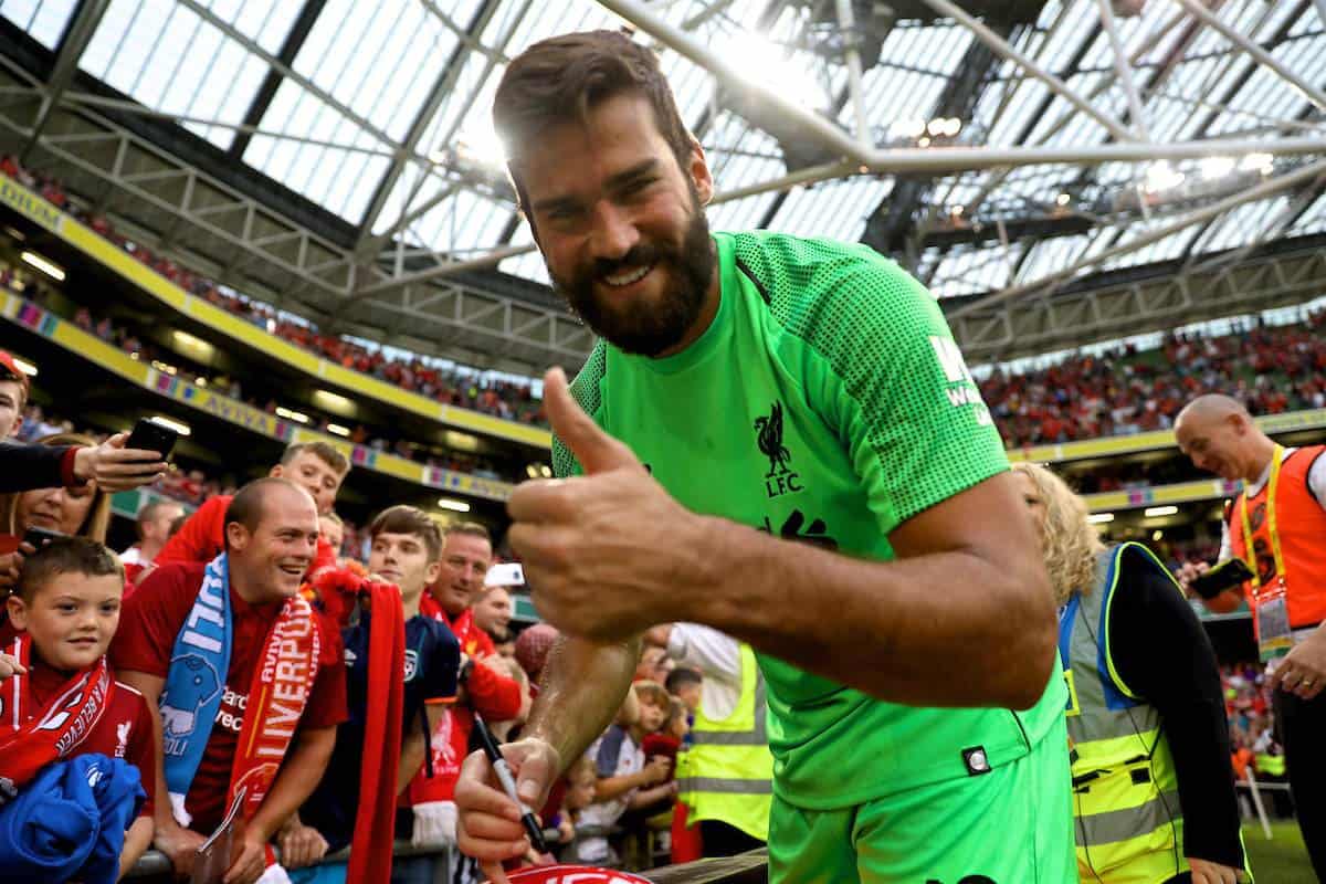 DUBLIN, REPUBLIC OF IRELAND - Saturday, August 4, 2018: Liverpool's new signing goalkeeper Alisson Becker during the preseason friendly match between SSC Napoli and Liverpool FC at Landsdowne Road. (Pic by David Rawcliffe/Propaganda)