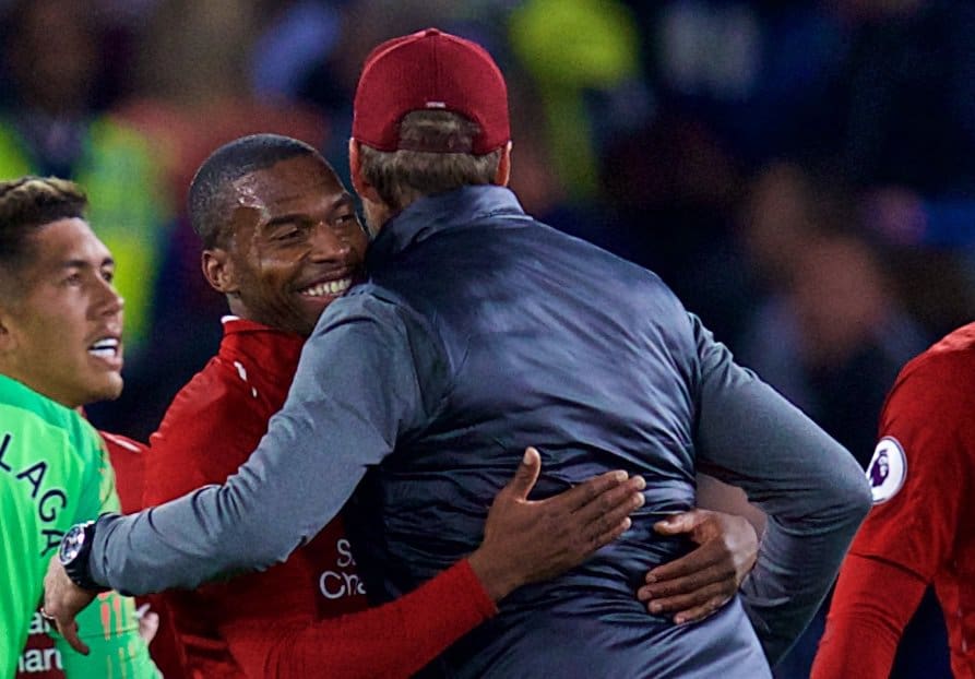 LONDON, ENGLAND - Saturday, September 29, 2018: Liverpool's Daniel Sturridge embraces manager J¸rgen Klopp after the FA Premier League match between Chelsea FC and Liverpool FC at Stamford Bridge. (Pic by David Rawcliffe/Propaganda)