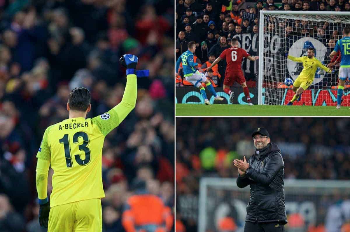 LIVERPOOL, ENGLAND - Tuesday, December 11, 2018: Liverpool's goalkeeper Alisson Becker celebrates after beating SSC Napoli 1-0 and progressing to the knock-out phase during the UEFA Champions League Group C match between Liverpool FC and SSC Napoli at Anfield. (Pic by David Rawcliffe/Propaganda)
