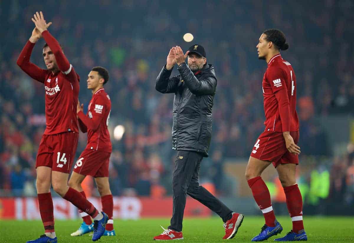 LIVERPOOL, ENGLAND - Boxing Day, Wednesday, December 26, 2018: Liverpool's manager Jürgen Klopp celebrates after beating Newcastle United 4-0 during the FA Premier League match between Liverpool FC and Newcastle United FC at Anfield. (Pic by David Rawcliffe/Propaganda)