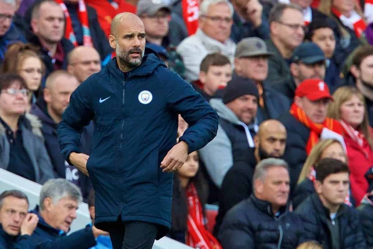LIVERPOOL, ENGLAND - Sunday, October 7, 2018: Manchester City's manager Pep Guardiola during the FA Premier League match between Liverpool FC and Manchester City FC at Anfield. (Pic by David Rawcliffe/Propaganda)