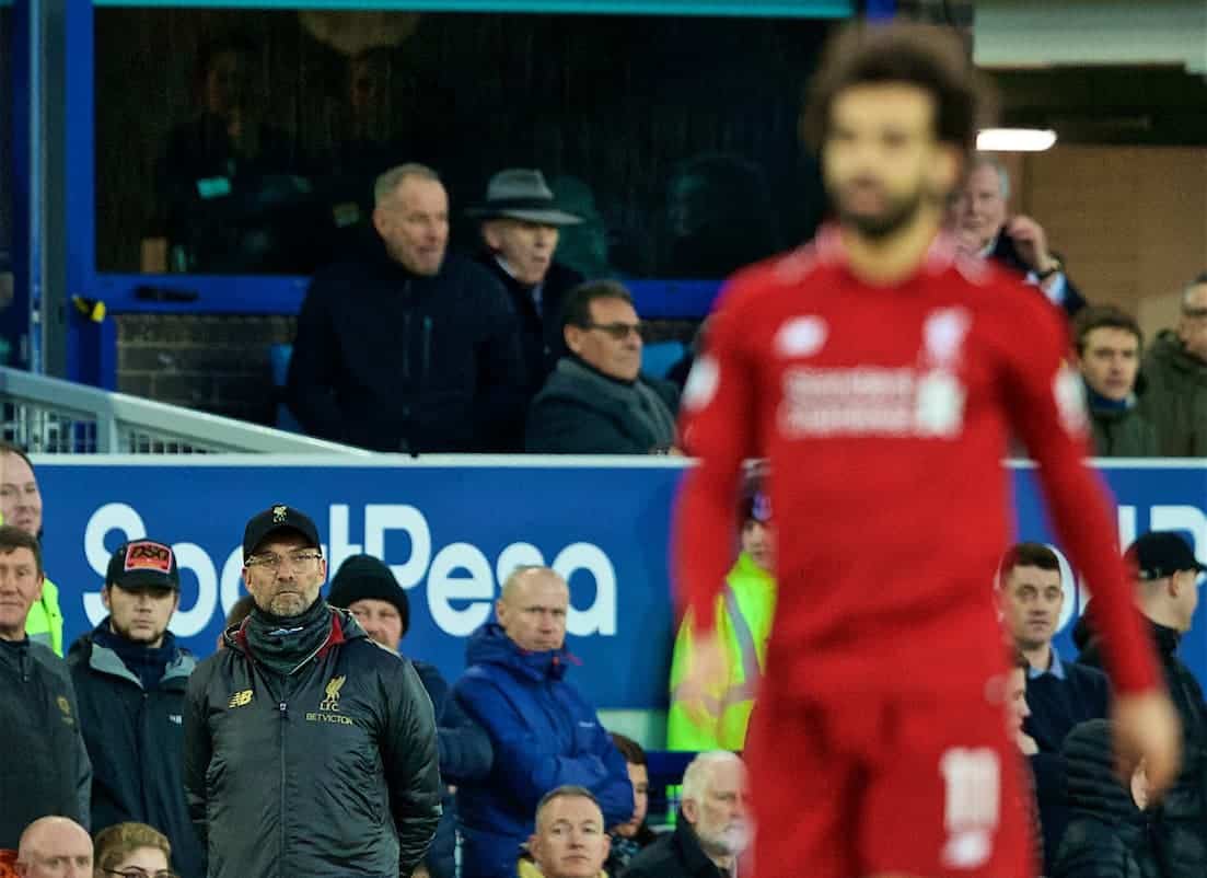LIVERPOOL, ENGLAND - Sunday, March 3, 2019: Liverpool's manager J¸rgen Klopp looks on at Mohamed Salah during the FA Premier League match between Everton FC and Liverpool FC, the 233rd Merseyside Derby, at Goodison Park. (Pic by Paul Greenwood/Propaganda)