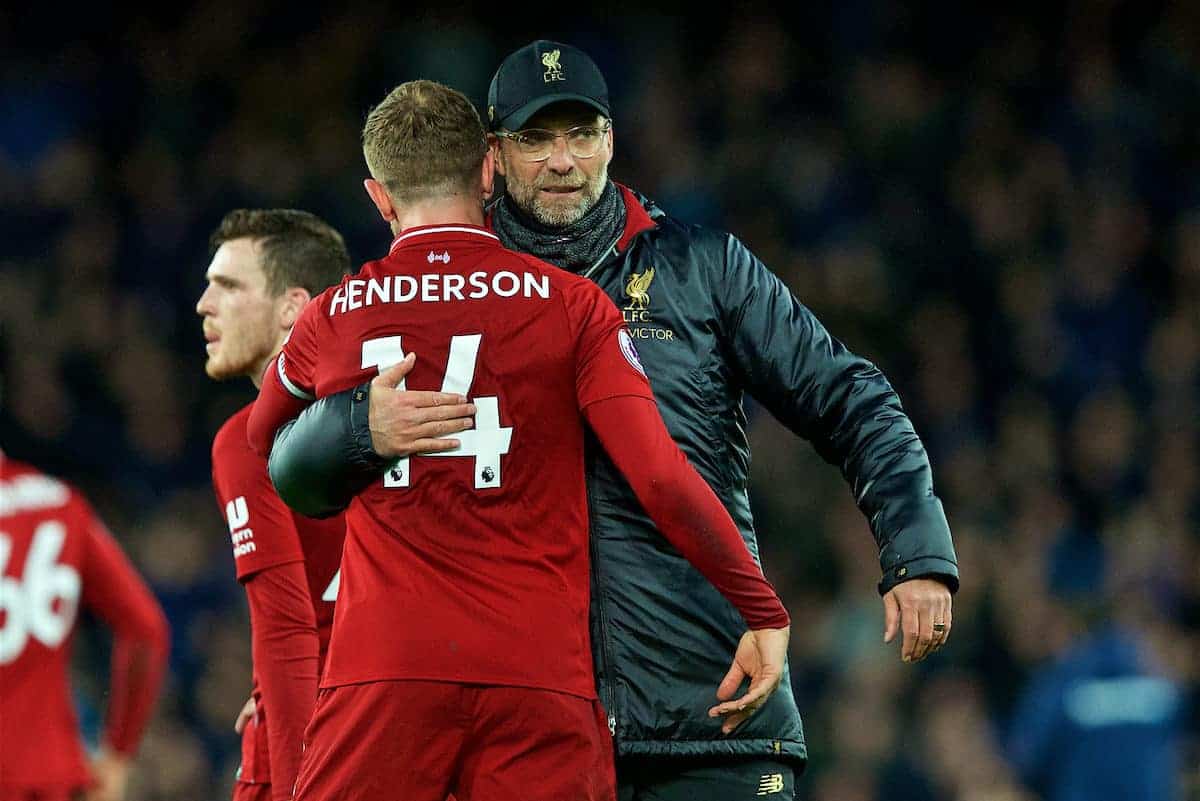 LIVERPOOL, ENGLAND - Sunday, March 3, 2019: Liverpool's manager Jürgen Klopp embraces captain Jordan Henderson after the goal-less draw during the FA Premier League match between Everton FC and Liverpool FC, the 233rd Merseyside Derby, at Goodison Park. (Pic by Paul Greenwood/Propaganda)