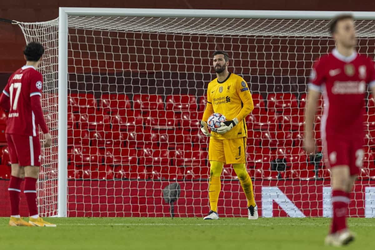 LIVERPOOL, ENGLAND - Wednesday, November 25, 2020: Liverpool's goalkeeper Alisson Becker (R) looks dejected as Atalanta score a second goal to make the score 0-2 during the UEFA Champions League Group D match between Liverpool FC and Atalanta BC at Anfield. (Pic by David Rawcliffe/Propaganda)