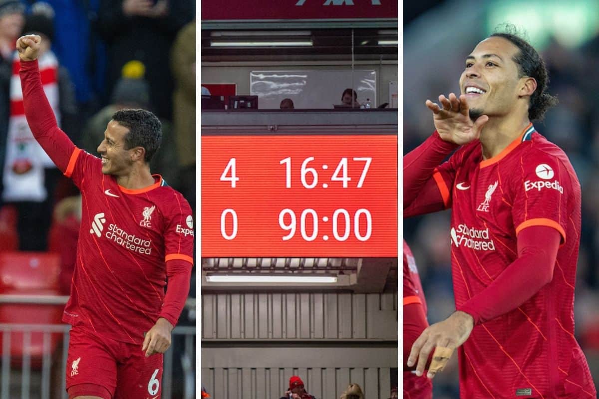 And the banners on the Kop hardly had a chance to find their resting place before the scoreboard read 1-0 in the Reds’ favour, Diogo Jota rewarding the endeavour from Andy Robertson.