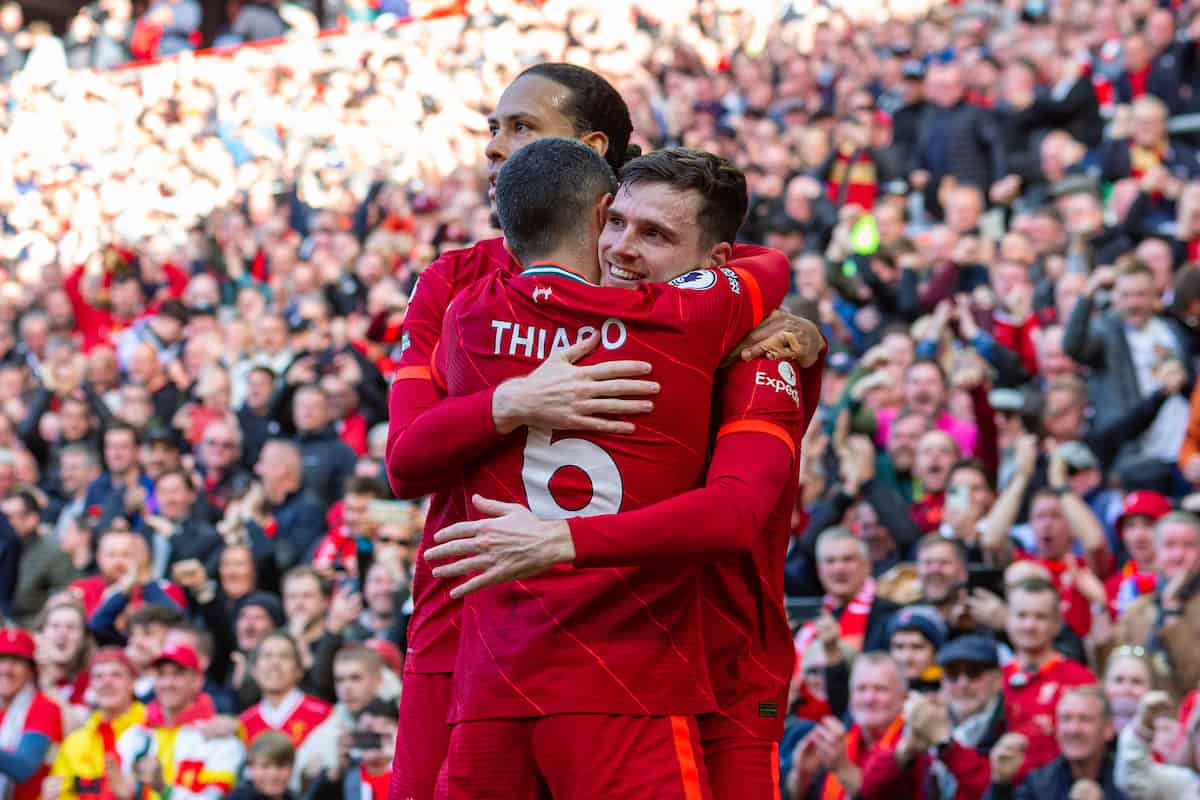 LIVERPOOL, ENGLAND - Sunday, April 24, 2022: Liverpool's Andy Robertson (R) celebrates after scoring the opening goal during the FA Premier League match between Liverpool FC and Everton FC, the 240th Merseyside Derby, at Anfield. Liverpool won 2-0. (Pic by Lindsey Parneby/Propaganda)
