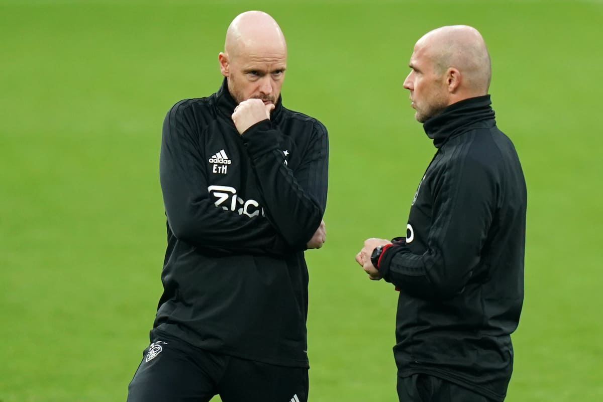 Ajax manager Erik ten Hag and assistant coach Alfred Schreuder during the training session at Tottenham Hotspur Stadium, London.