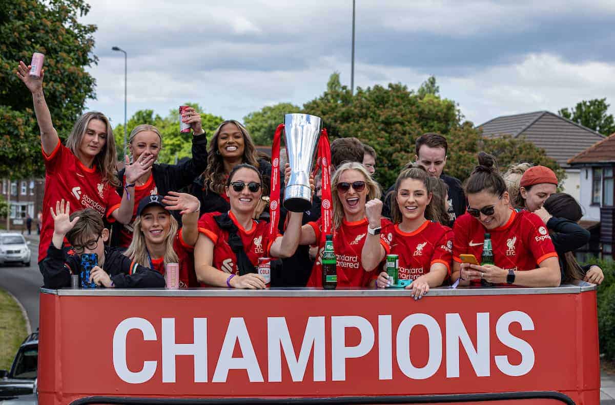 LIVERPOOL, ENGLAND - Sunday, May 29, 2022: Liverpool women's players with the FA Women's Championship trophy during a parade around the city. (Photo by David Rawcliffe/Propaganda)