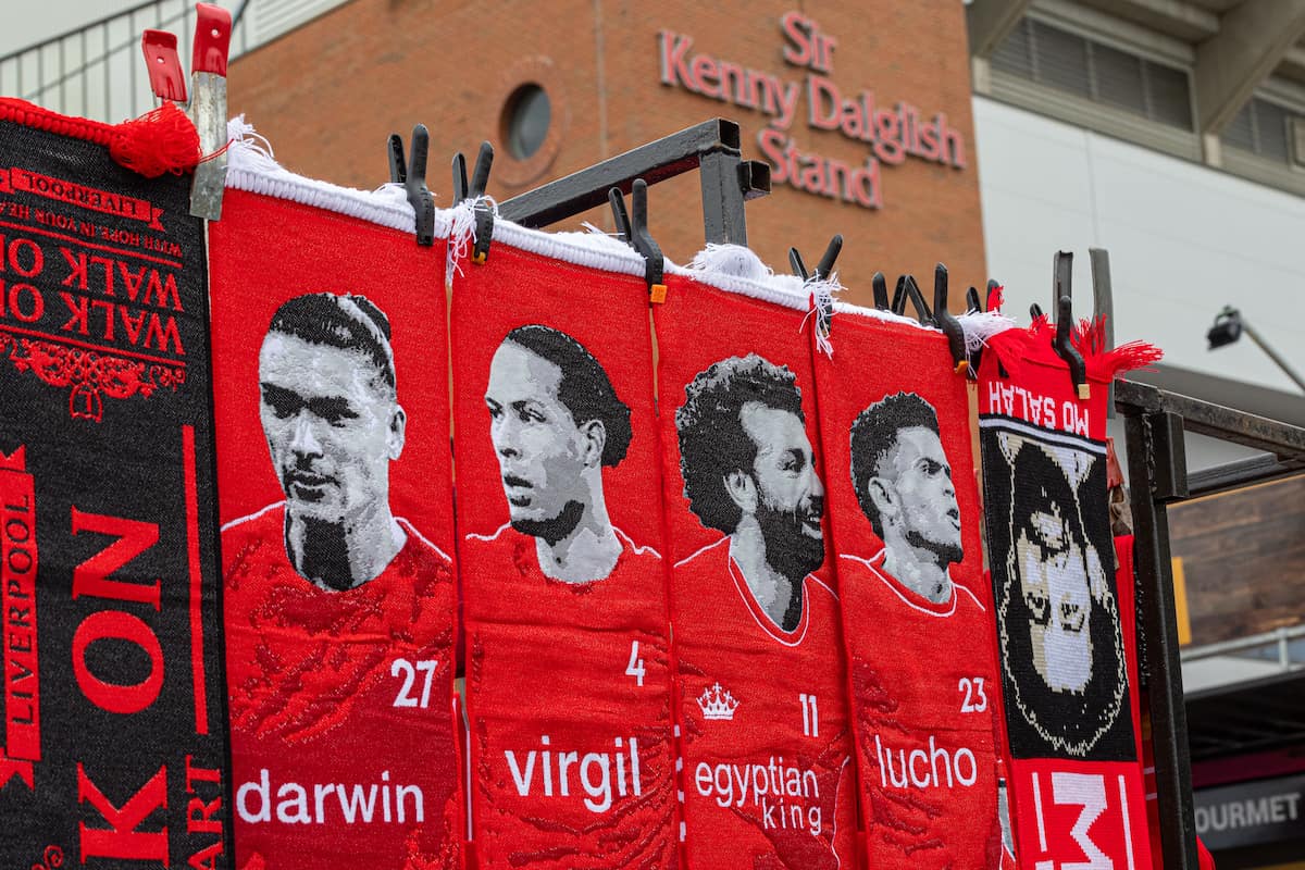 LIVERPOOL, ENGLAND - Sunday, October 16, 2022: Liverpool scarves on sale seen before the FA Premier League match between Liverpool FC and Manchester City FC at Anfield. (Pic by David Rawcliffe/Propaganda)