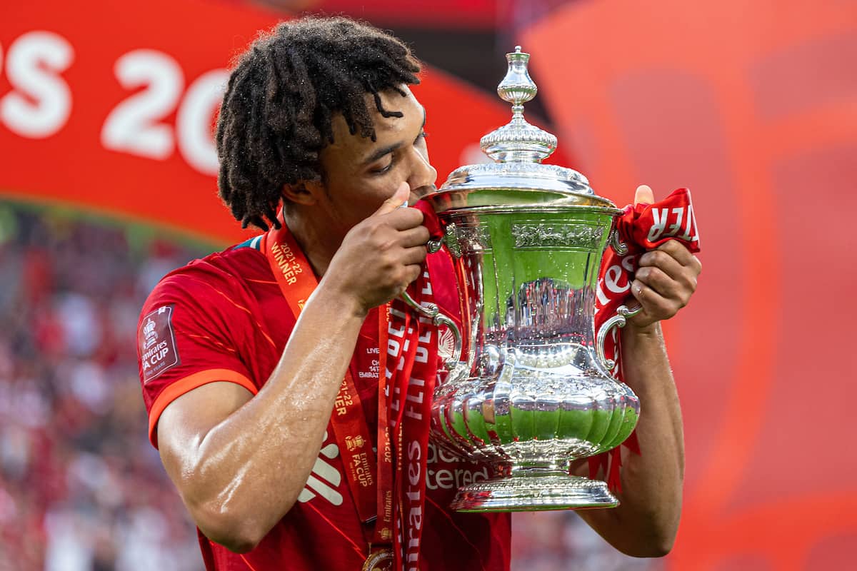 LONDON, ENGLAND - Saturday, May 14, 2022: Liverpool's Trent Alexander-Arnold kisses the trophy after the FA Cup Final between Chelsea FC and Liverpool FC at Wembley Stadium. The game ended in a goal-less draw, Liverpool won 6-5 on penalties. (Pic by David Rawcliffe/Propaganda)