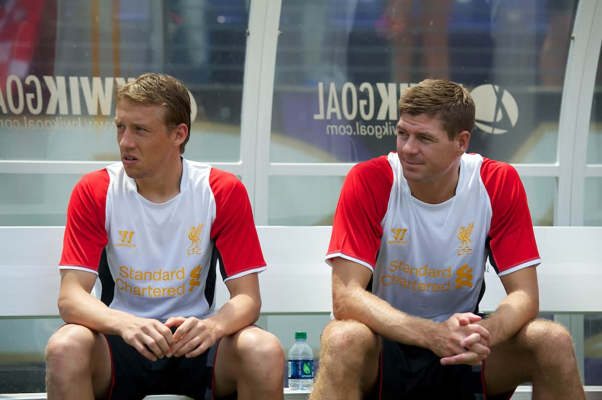 BALTIMORE, MD - Saturday, July 28, 2012: Liverpool's Lucas Leiva and captain Steven Gerrard before a pre-season friendly match against Tottenham Hotspur at the M&T Bank Stadium. (Pic by David Rawcliffe/Propaganda)