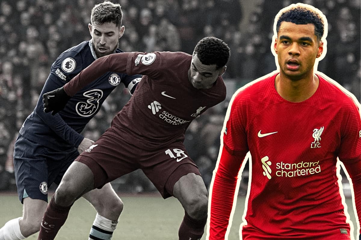 LIVERPOOL, ENGLAND - Saturday, January 21, 2023: Liverpool's Cody Gakpo is challenged by Chelsea's Lewis Hall (R) during the FA Premier League match between Liverpool FC and Chelsea FC at Anfield. (Pic by David Rawcliffe/Propaganda)