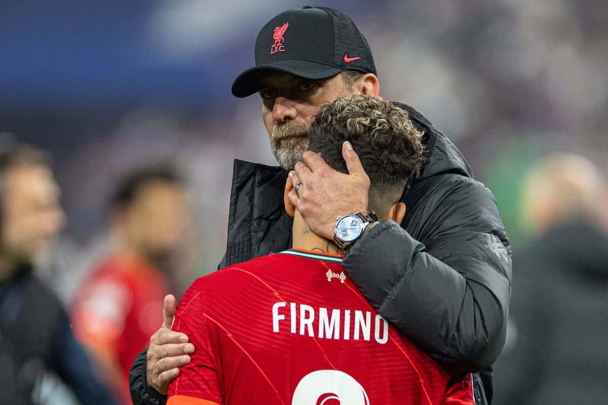 PARIS, FRANCE - Saturday, May 28, 2022: Liverpool's Roberto Firmino is embraced by manager Jürgen Klopp at the final whistle during the UEFA Champions League Final game between Liverpool FC and Real Madrid CF at the Stade de France. Real Madrid won 1-0. (Photo by David Rawcliffe/Propaganda)