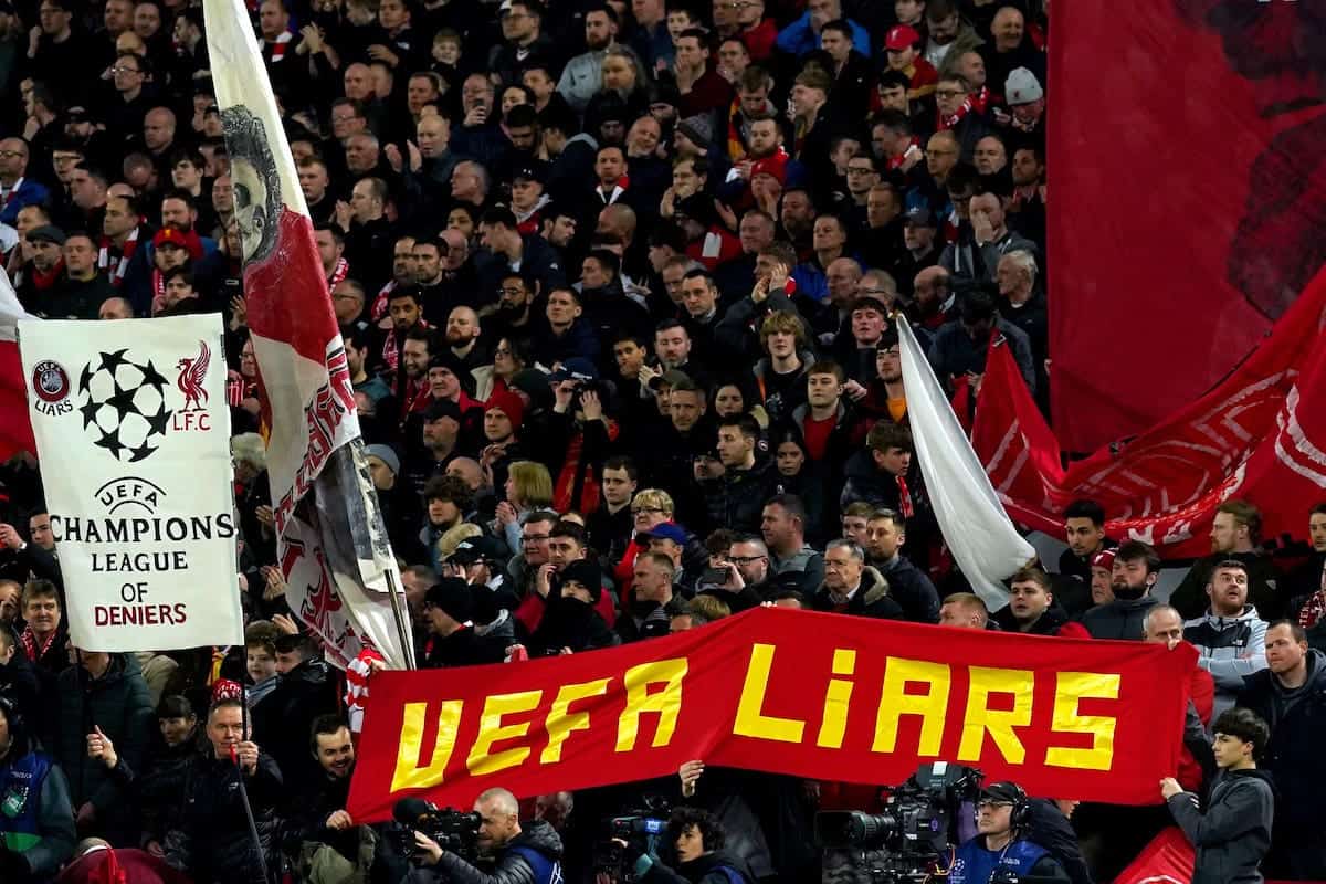 “Shame on those Kop stewards ripping down the anti-UEFA flags,” wrote another fan, Daniel Nicolson, on Twitter.