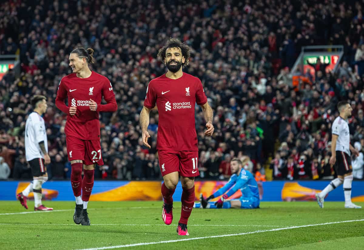 LIVERPOOL, ENGLAND - Sunday, March 5, 2023: Liverpool's Mohamed Salah celebrates after scoring the fourth goal during the FA Premier League match between Liverpool FC and Manchester United FC at Anfield. (Pic by David Rawcliffe/Propaganda)